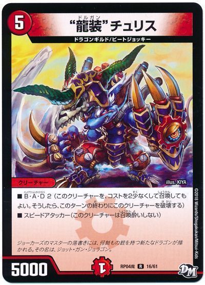 そのカードの名は龍装チュリス、新能力BADによって3マナで召喚できる5コストのドラゴンです。5コストのドラゴンを3マナで出せるという事は3T目にドギラゴン剣によって6打点作れることを意味します。これまでは5コスの超次元呪文や小型獣→5コスの革命チェンジ獣を使って成長させたり、5コスのイーヴィルヒートや6コスのリンネ・ヴィーナスをコスト軽減やマナ加速を駆使して早期着地させることですら環境上位に君臨したドギラゴン剣にこんな専用カードを与えていいのかと多くの決闘者に疑問を抱かせました。